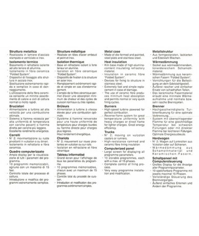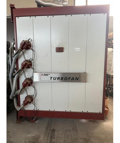 Art. 4315 N° 01 Forno a gas turbo MORETTI mod. FDN/4 – Macchina usata – Temperatura max d’esercizio : 1200 °C – Capacità utile di carico: 4 m3 – Isolamento interno: Fibra ceramica – Camino a fiamma rovescia – Aperture camino in volta per raffreddamento supplementare e camino fiamma rovescia automatiche controllate dal computer – N° Carri: 02 su ruote in wulkollan ( N° 1 all’interno + N° 1 in stand-by , quest’ultimo senza piastre e mattoni di suola ) – Trattorino elettrico per movimentazione carri assistita – N° bruciatori: 8 – Alimentazione bruciatori: GPL ( se necessario modificabile a Metano) – Completo di quadro elettrico con computer MORETTI mod. TERMOR 2000 – Termoregolatore di sicurezza ASCON – Dimensioni utili di carico: 1040 x 2750 x h 1400 mm – Dimensioni di ingombro ( quando installato) : 2650 x 4280 x h 3500 mm (forno installato con camino fiamma rovescia e cappa )